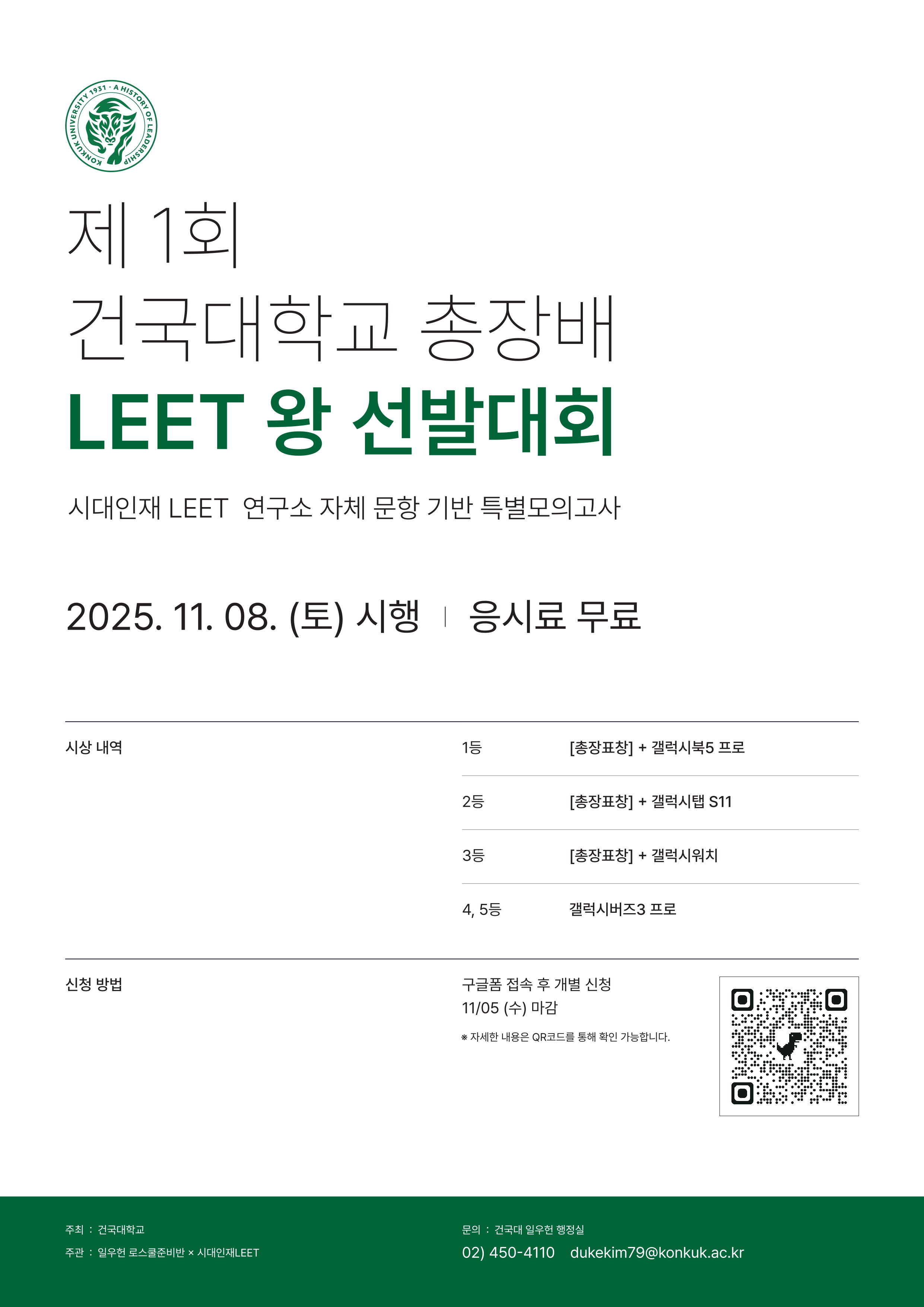 fnctId=bbs,fnctNo=453 단축 url 글번호 1159924 [일우헌] 제1회 건국대학교 총장배 LEET왕 선발대회 홍보 작성자 융합과학기술원 행정실 조회수 18 등록일 2025.10.21 수정일 2025.10.21 첨부파일 제1회 건국대학교 총장배 LEET왕 선발대회 포스터.pdf 미리보기 이전글 4+1학석사연계과정 제13회 예비선발 및 설명회 시행 공고 2025-10-14 10:16:41.935 다음글 [혁신사업] 실험실창업문화확산: 2025 K² Pre-TeX-Corps 프로그램 참가 희망자 모집안내 (참가비 지원) 2025-10-22 09:21:36.068